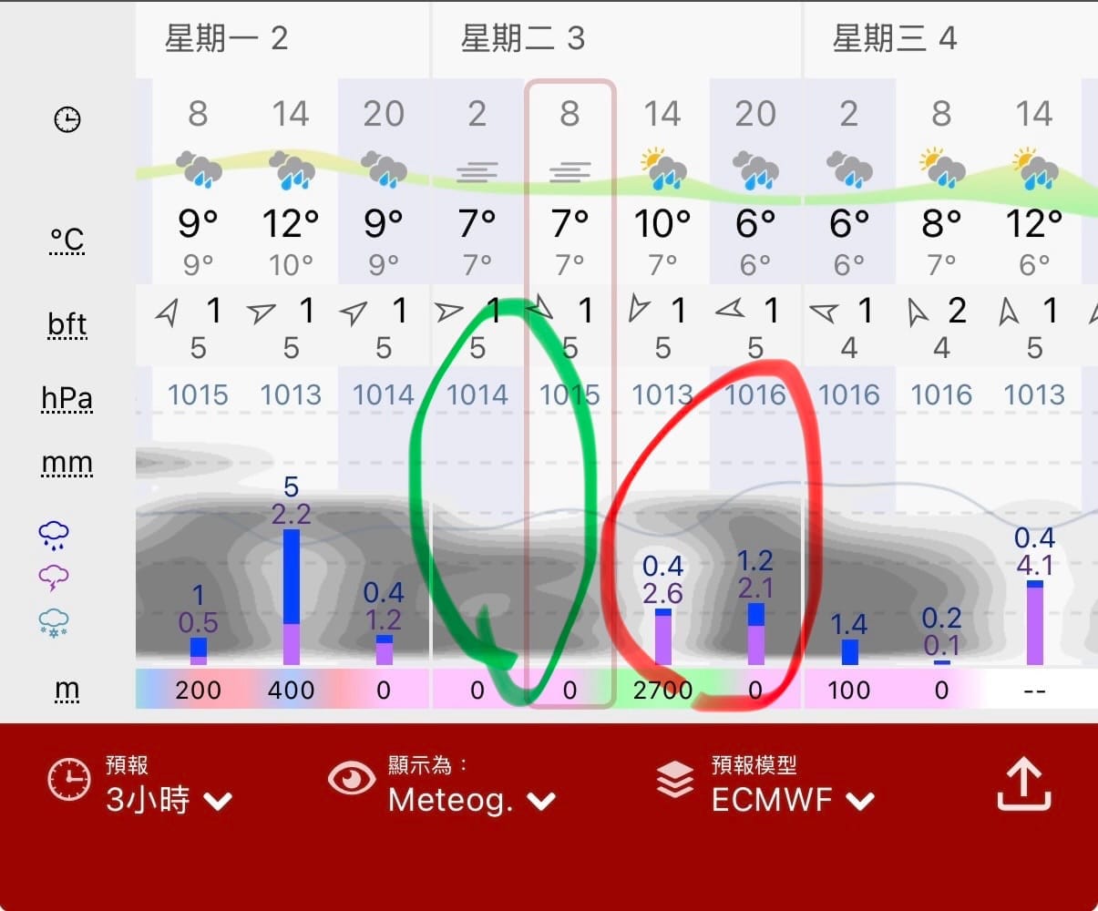 - 動作: 使用 Windy 的 「降雨積算」 與 「雲層剖面」,配合 CWA 的逐三小時預報。