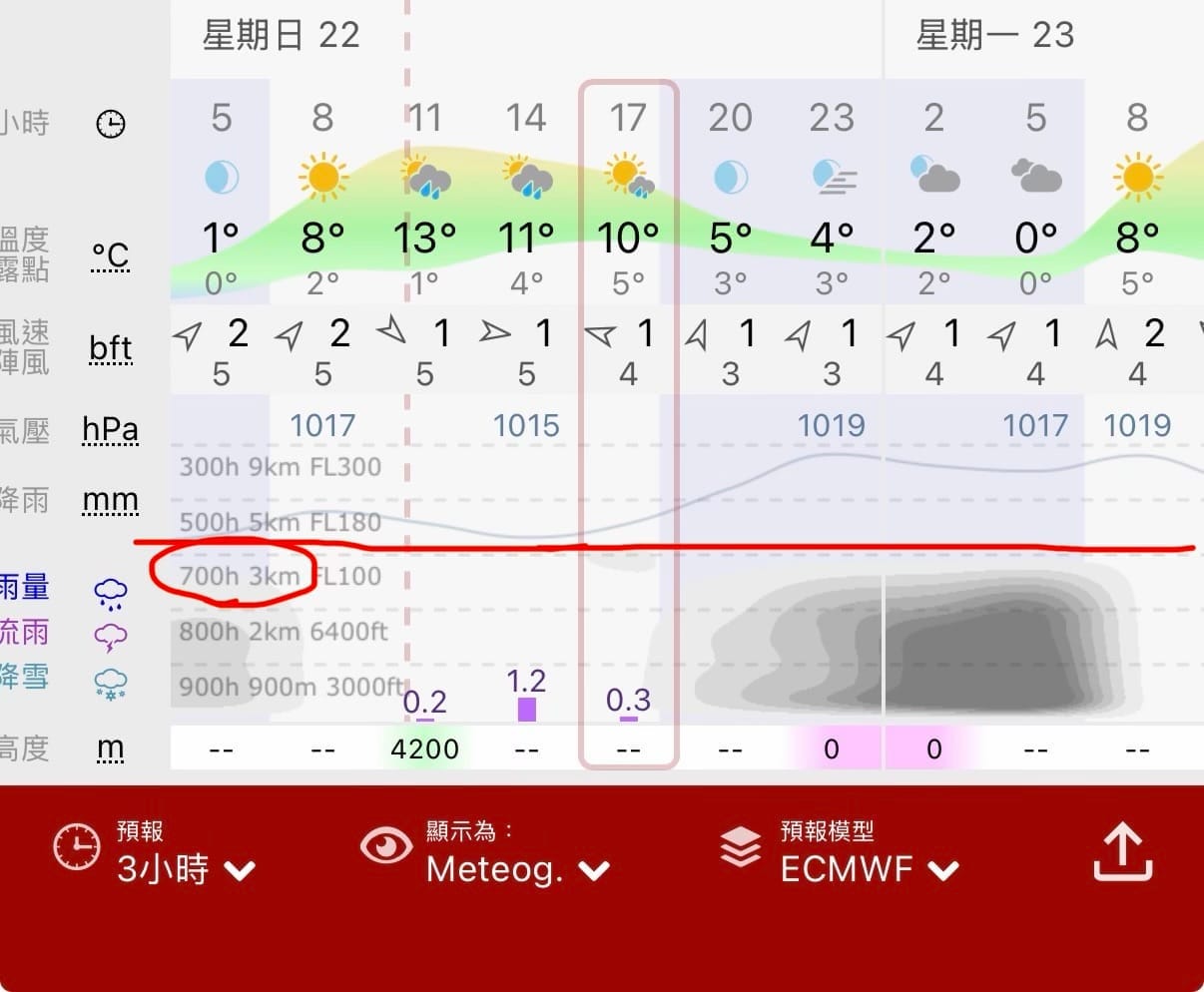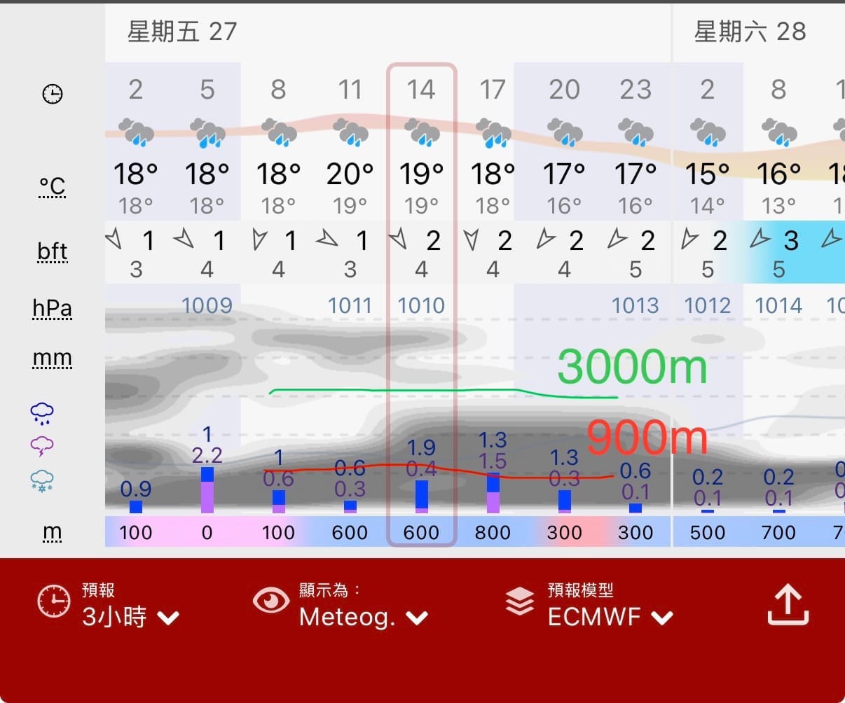 - 縱軸(高度): 圖表左側是氣壓/高度。對台灣百岳來說,請緊盯著 700hPa (約 3000公尺) 這條線,這就是你所在的高度。 (如果在郊山或中級山,則可參考900hPa = 900公尺,或是800hPa = 2000公尺,依據您所在的海拔判斷也會有所不同)
