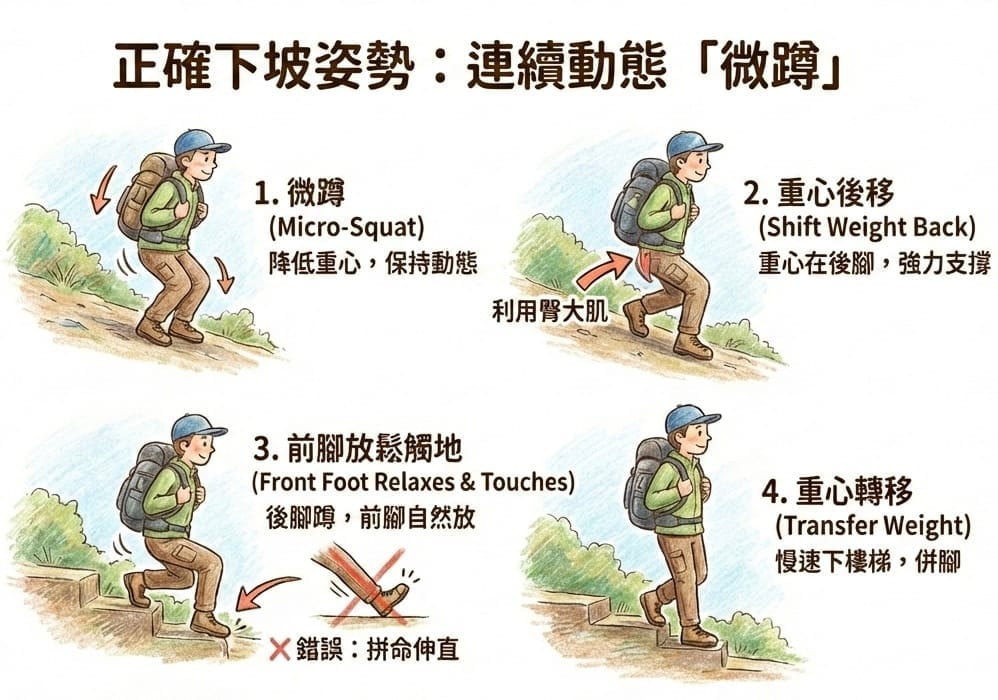 - 技巧: 走「Z字型」路徑。不要直直往下衝,斜著走能有效降低坡度對膝蓋的衝擊。