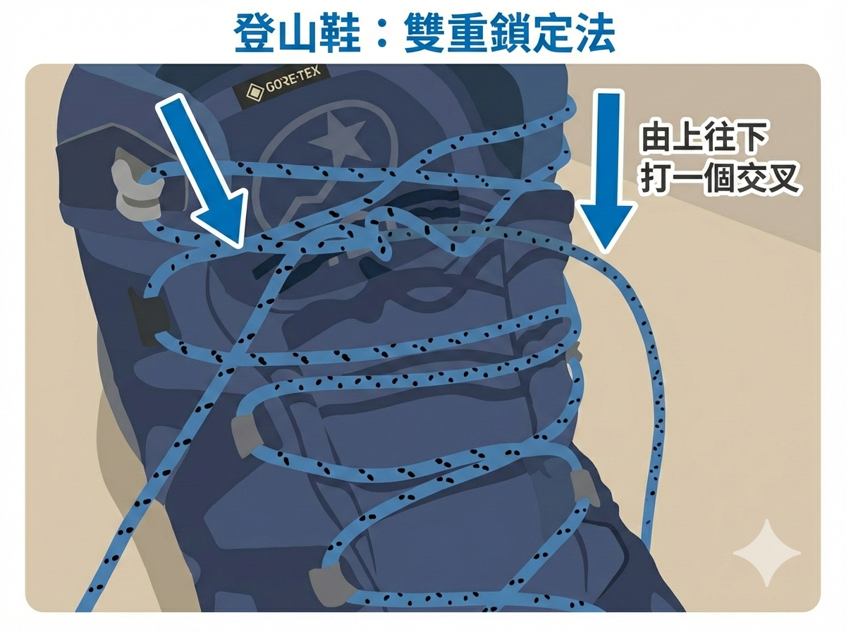 - 雙重鎖定:通常登山鞋最上面兩組都是掛勾而非鞋孔。將鞋帶先從掛勾「由上往下」固定後,利用掛勾將鞋帶咬緊,打兩個交叉後再綁一個蝴蝶結固定。