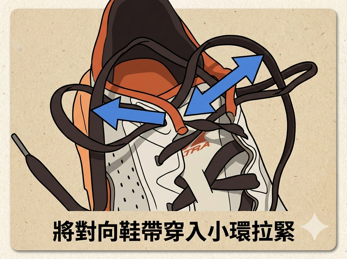 - 鞋舌對正: 確保鞋帶壓在鞋舌正中央,提供均勻的緩衝力。