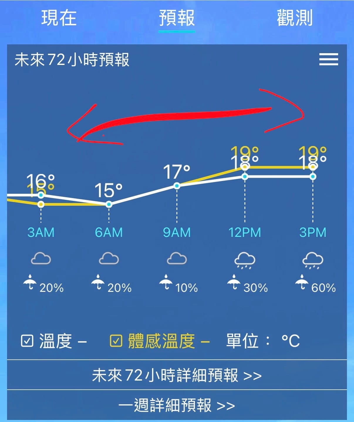 - 左右滑動預報,根據自己預計的起登時間,觀察預報中的降雨機率。