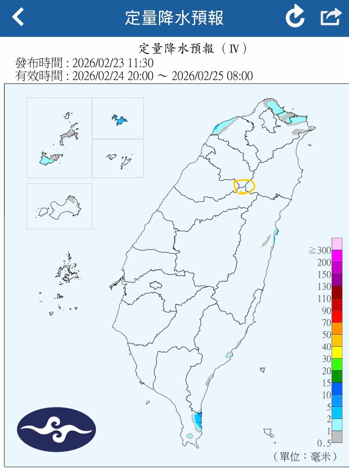 - 定量降水預報圖在雪山山脈區域呈現白色(無色)。
