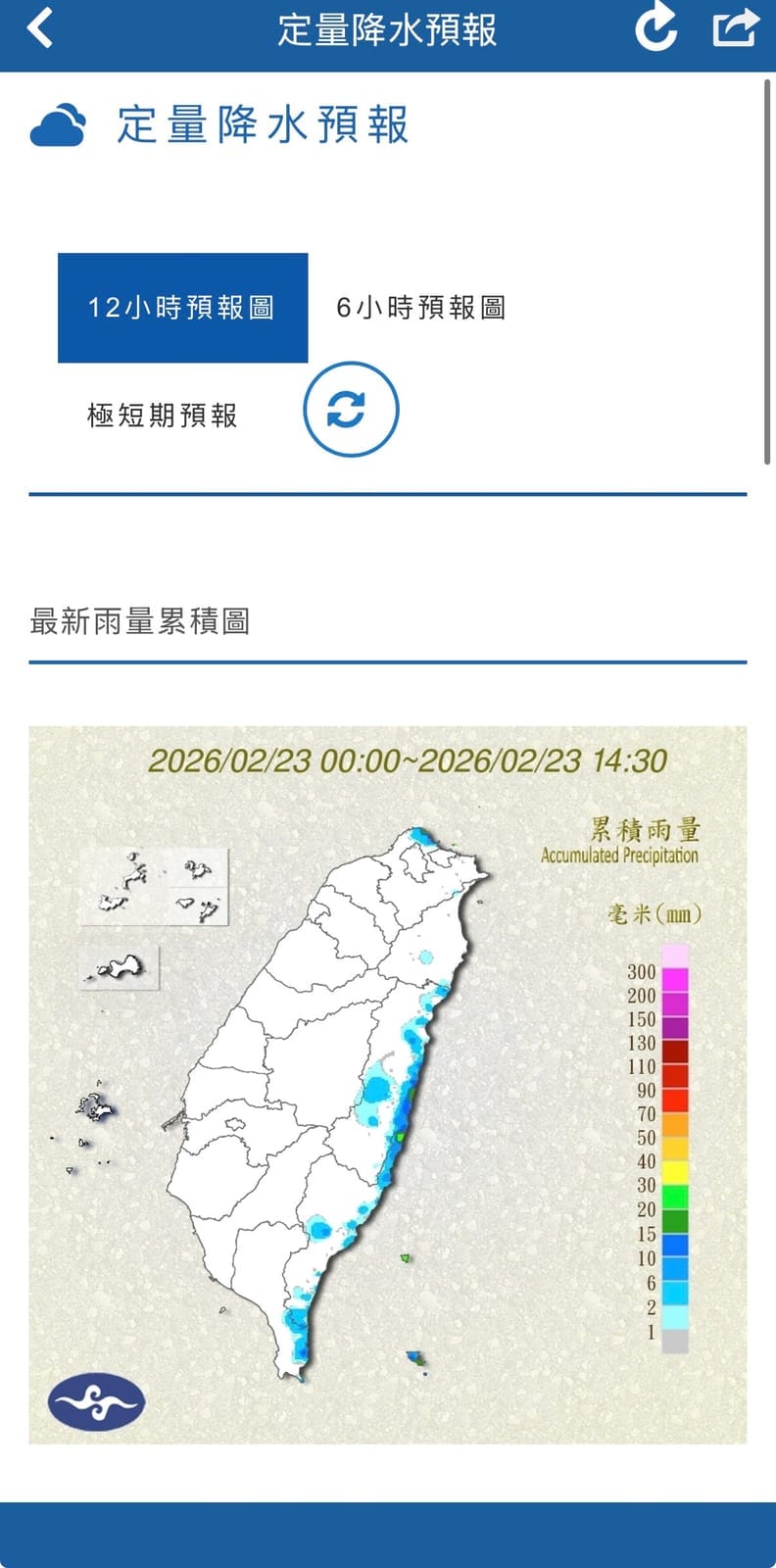 以2/23下午查詢為例,可以看到直到2/25早上的定量降水預報。