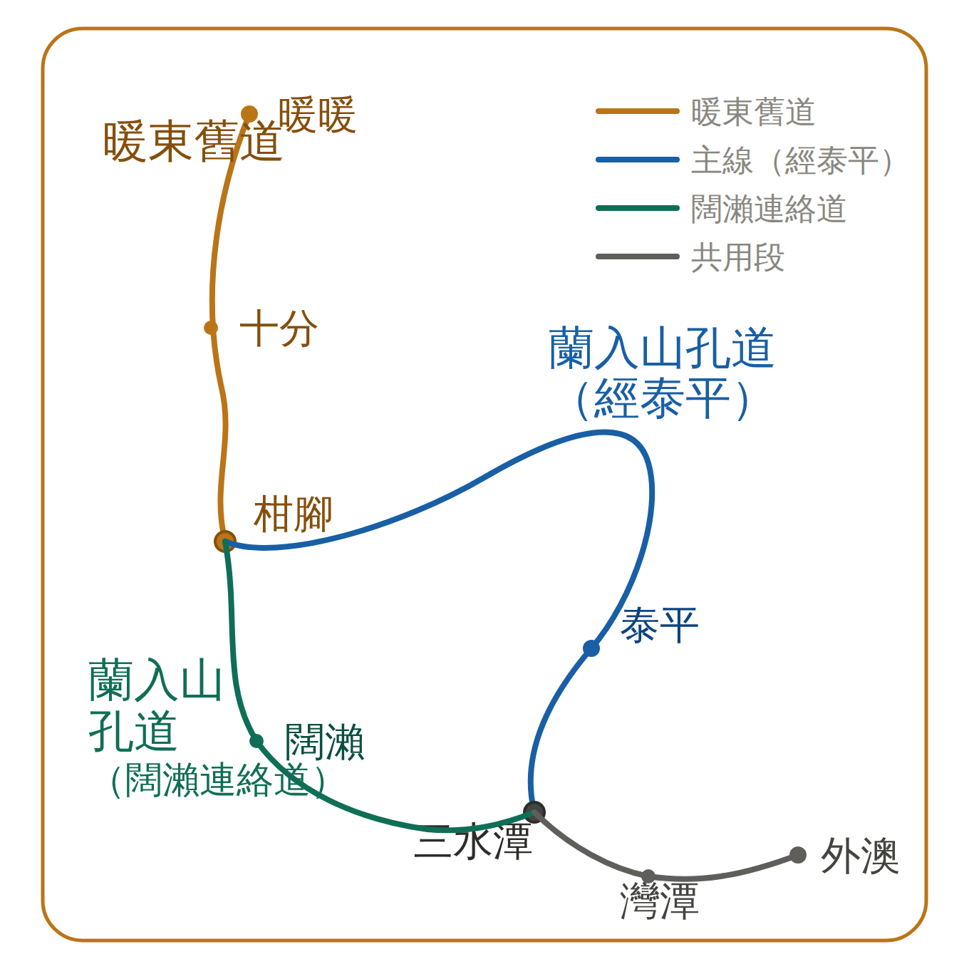 | 暖東舊道段 | 暖暖→暖東峽谷→五分山→十分 | 約 12K | TK2-1~TK2-5 | ★★☆ | 軍用古道+煤礦遺跡+小百岳 |