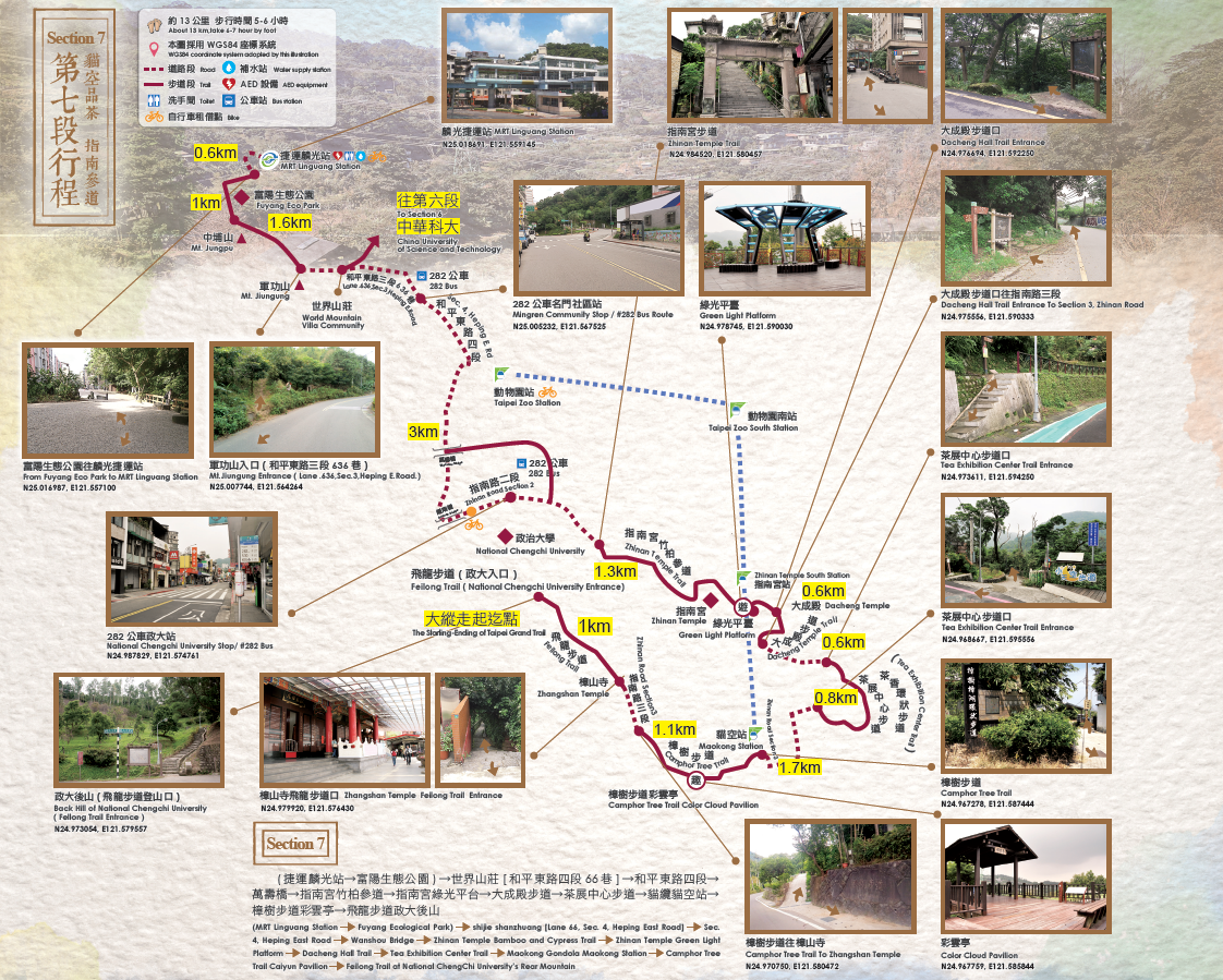 詳細路線順序: 捷運麟光站 ➔ 富陽生態公園 ➔ 軍功山 ➔ 世界山莊 ➔ 和平東路四段 ➔ 萬壽橋 ➔ 指南宮竹柏參道入口 ➔ 指南宮千階步道 ➔ 指南宮綠光平台 ➔ 大成殿步道 ➔ 茶展中心步道 ➔ 樟樹步道 ➔ 樟山寺 ➔ 飛龍步道 ➔ 政大校門