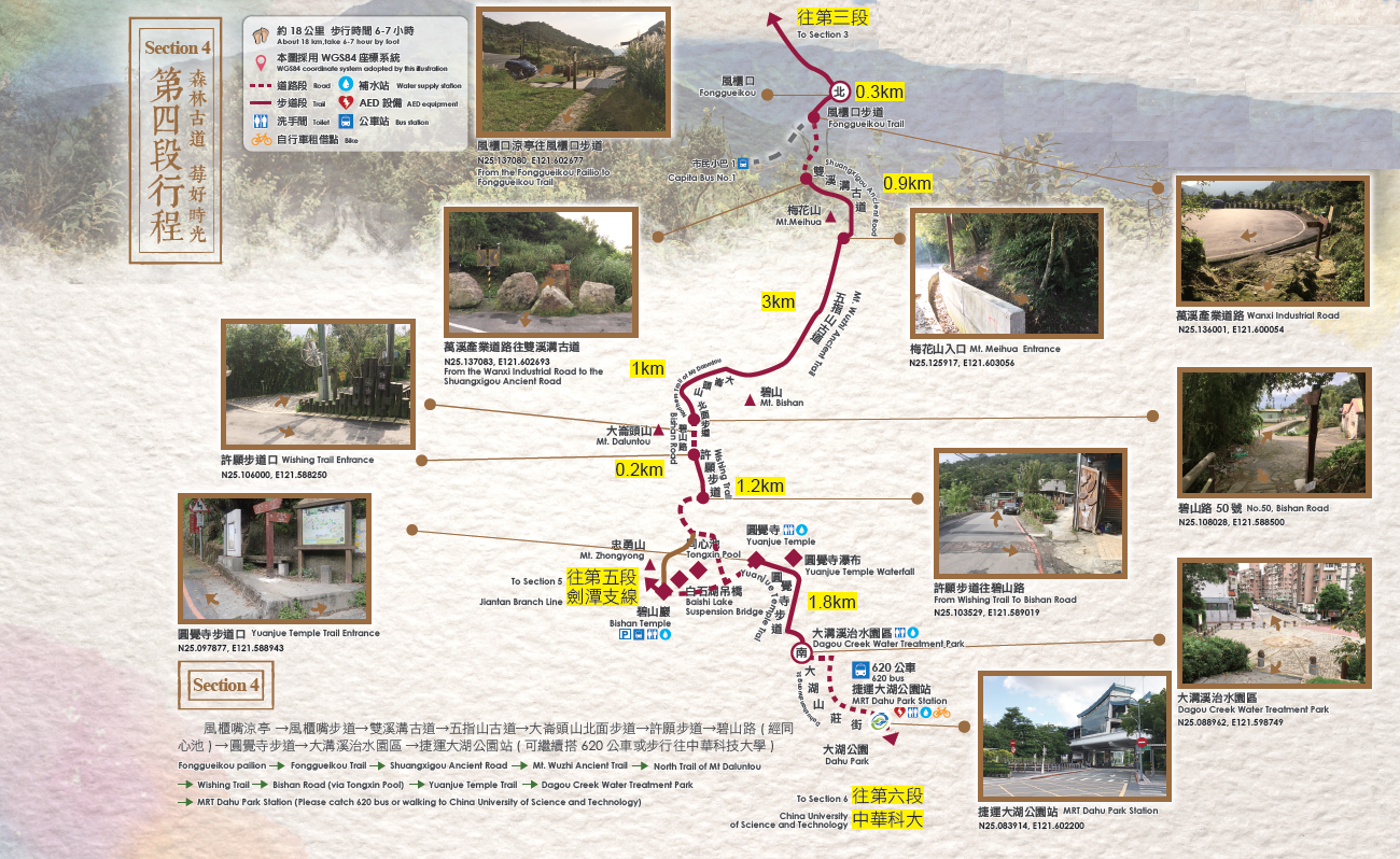 風櫃嘴 ➔ 雙溪溝古道 ➔ 梅花山 ➔ 五指山古道 ➔ 碧山 ➔ 圓覺寺步道 ➔ 圓覺瀑布 ➔ 葉姓祖廟 大溝溪生態治水園區 ➔ 捷運大湖公園站